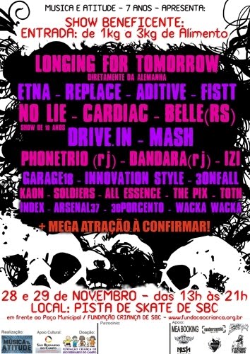 Quem toca: Longing for tomorrow (Alemanha); Etna, Replace, Aditive, Garage 18, Fistt, No lie, Cardiac, Belle (RS), DriveIn, Mash, Phonetrio (RJ), Dandara (RJ) , Izi, Innovation Style, 3onfall, Kaon, Soldiers, All Essence, The Pix, Totn, Index, Arsenal 37, 30Porcento, Wacka Wacka (?). E segundo eles, ainda estão confirmando uma tal de "mega-atração". UFA!